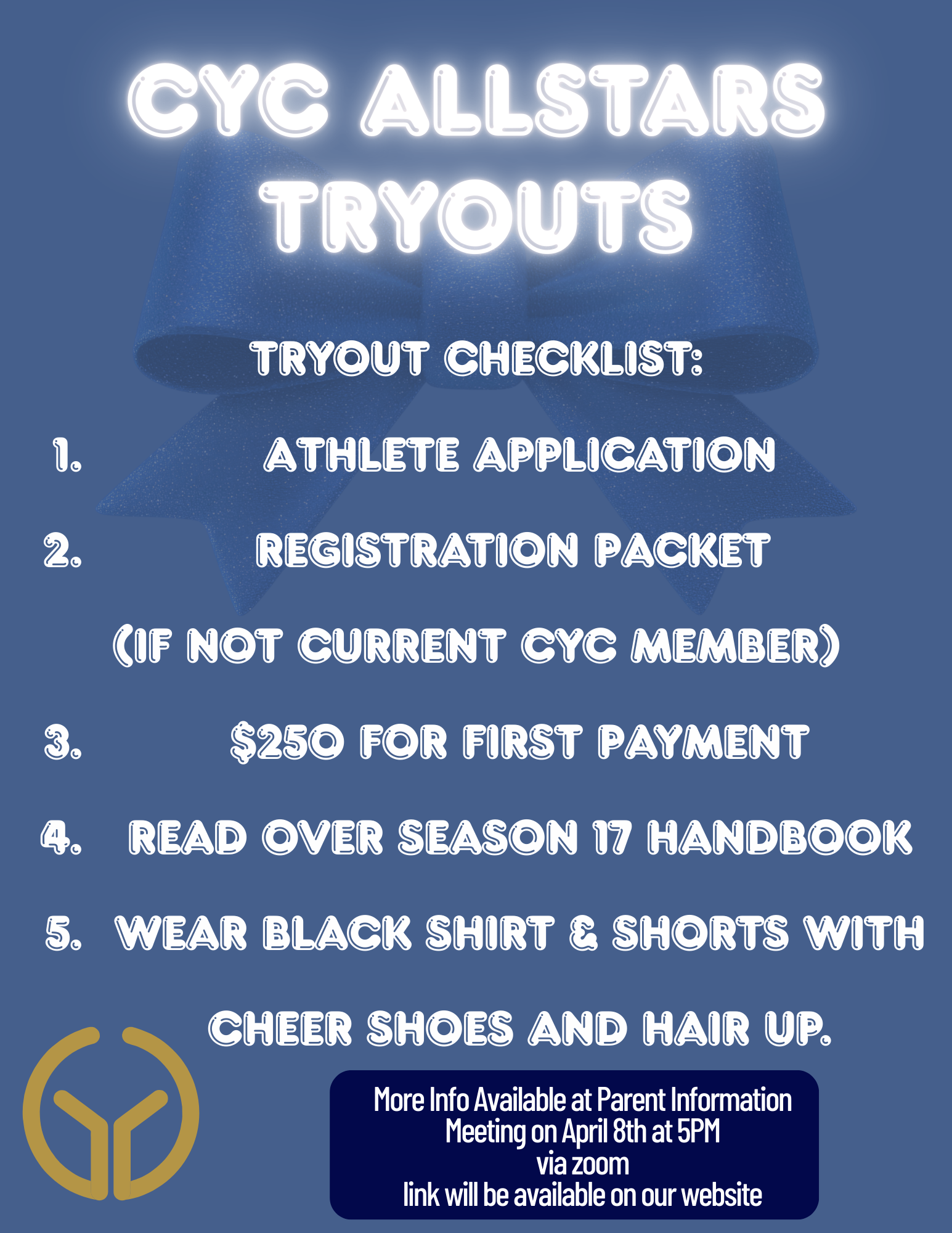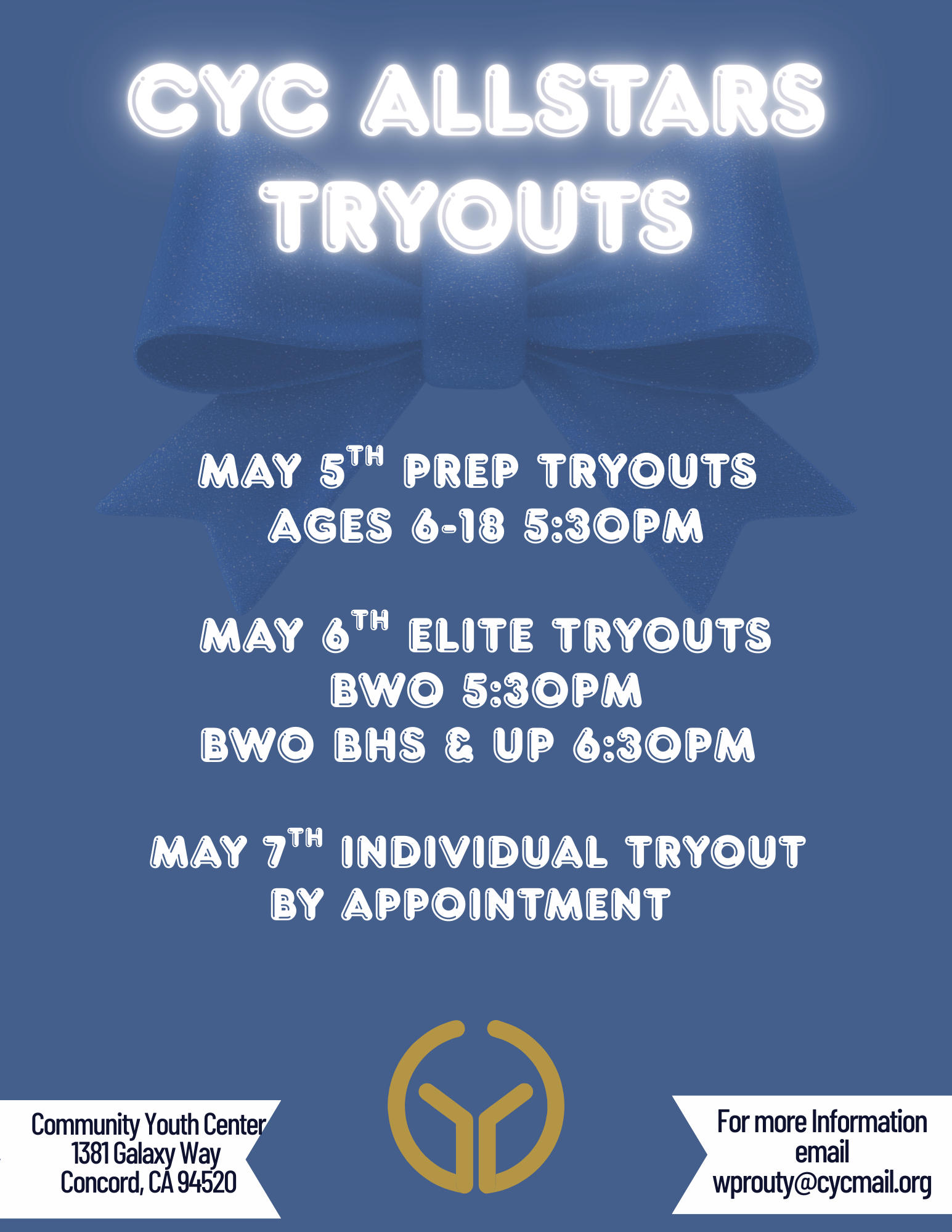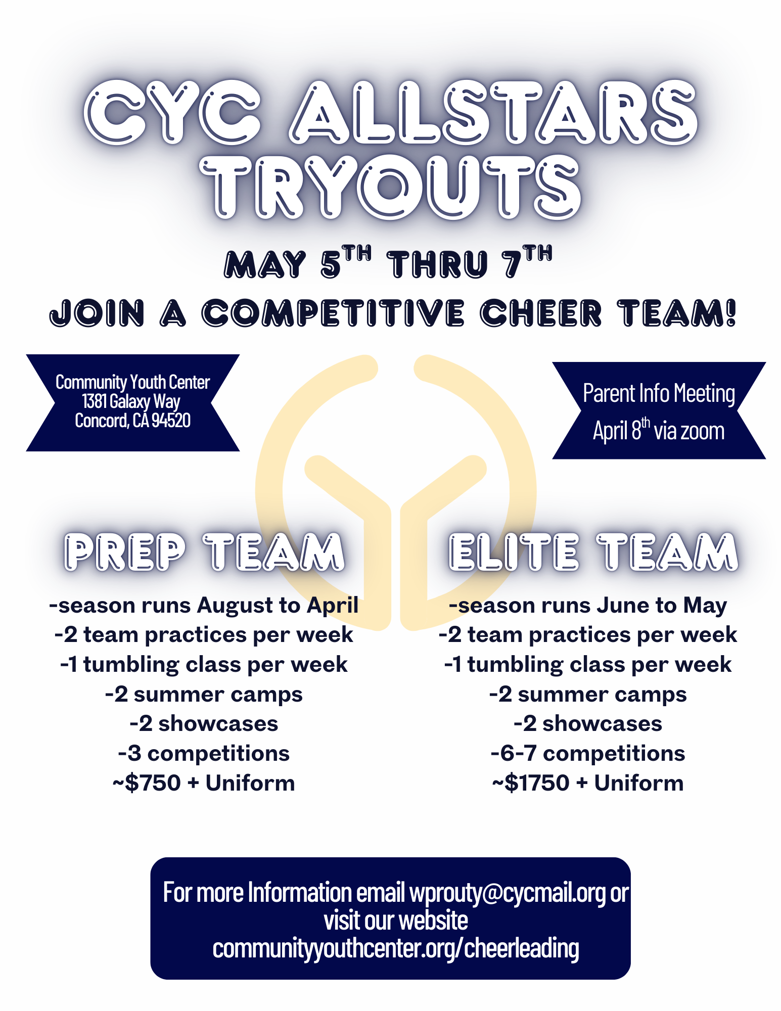 Come join us for CYC Cheer “Open Gym” — a fun, informal training session where athletes can practice skills, connect with coaches, and enjoy the cheer community.