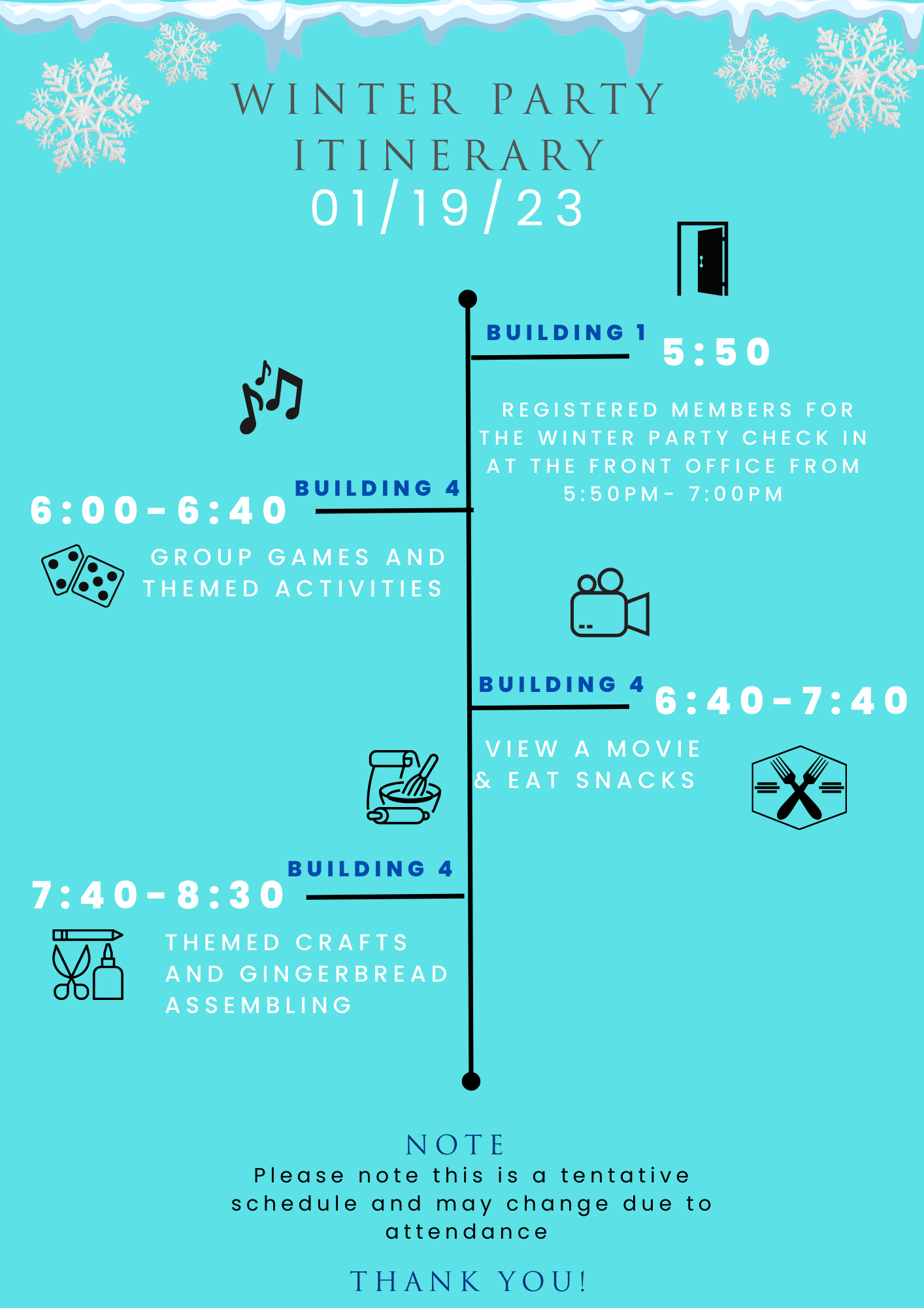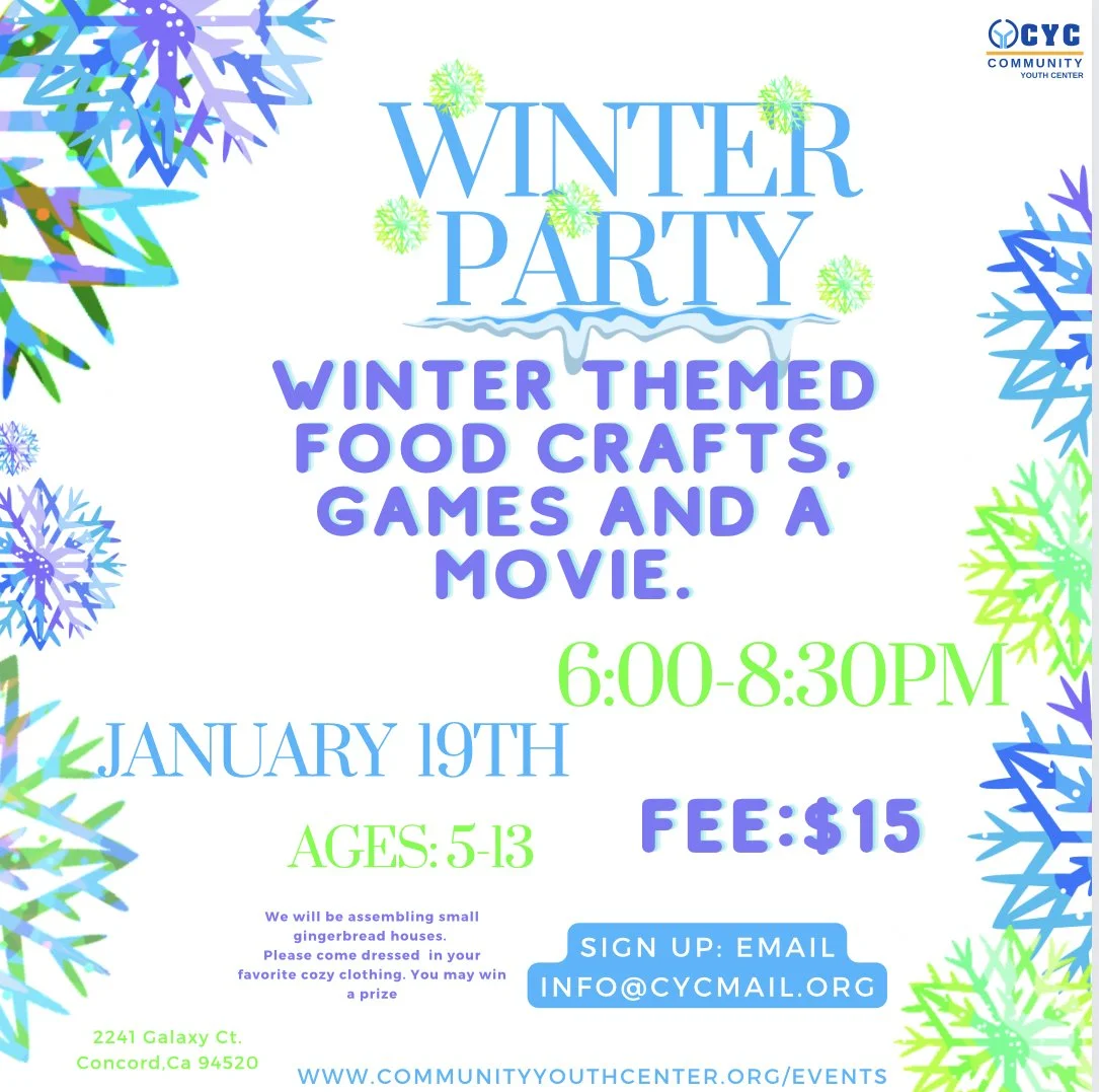 Winter Party - Hosted by: Dance Program Friday, January 19, 2024 6:00 PM 8:30 PM Community Youth Center 2241 Galaxy Court Concord, CA, 94520 United States (map) Google Calendar ICS Sign Up Here