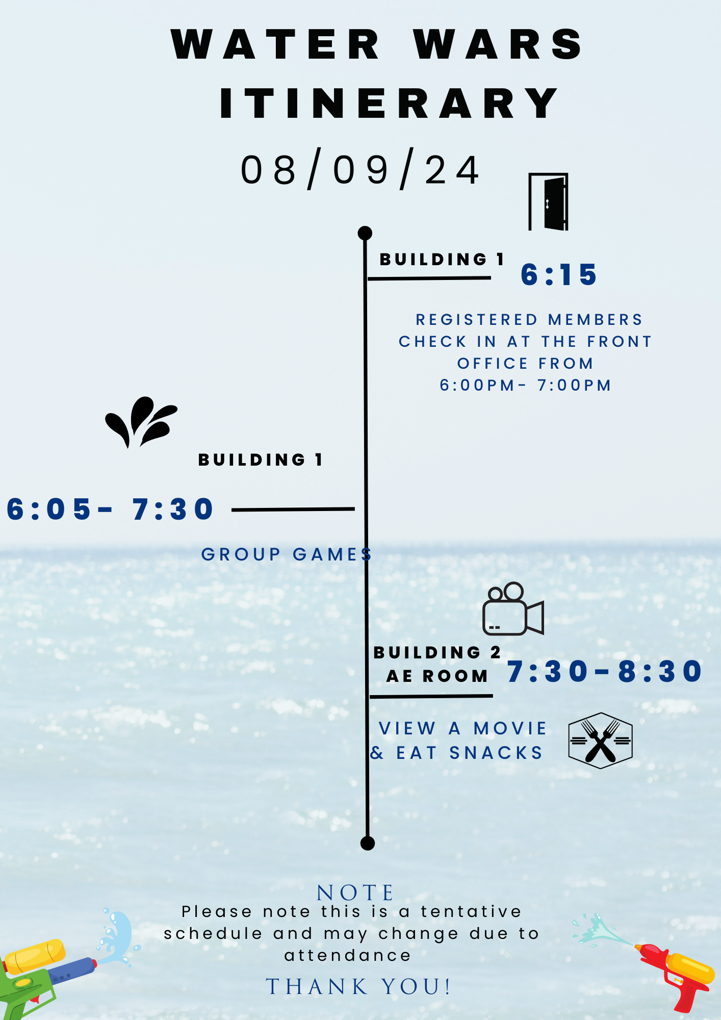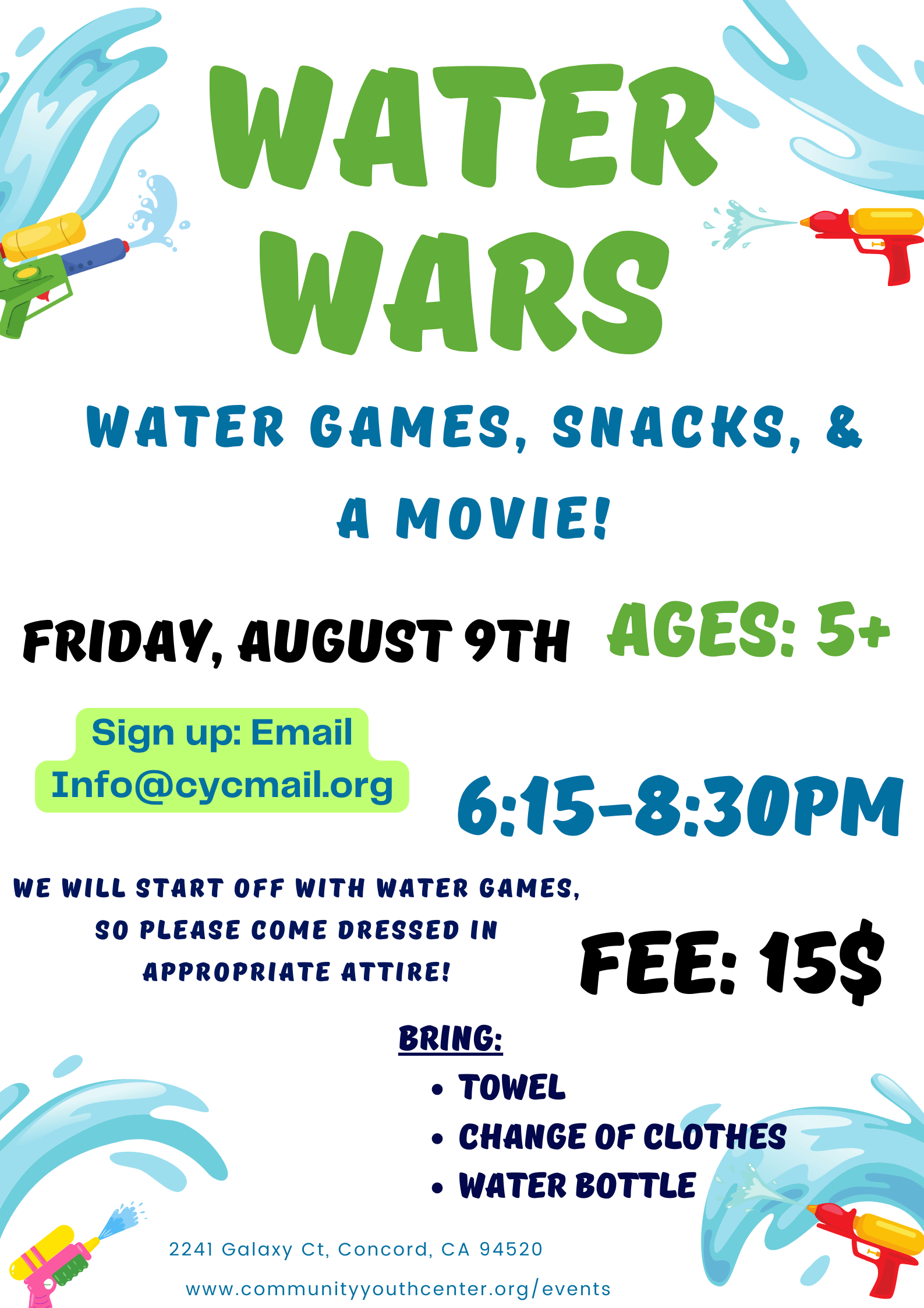 “Water Wars” - Hosted by the Dance Program Friday, August 9, 2024 6:15 PM 8:30 PM Community Youth Center 2241 Galaxy Court Concord, CA, 94520 United States (map) Google Calendar ICS Sign Up:Email: Info@cycmail.org
