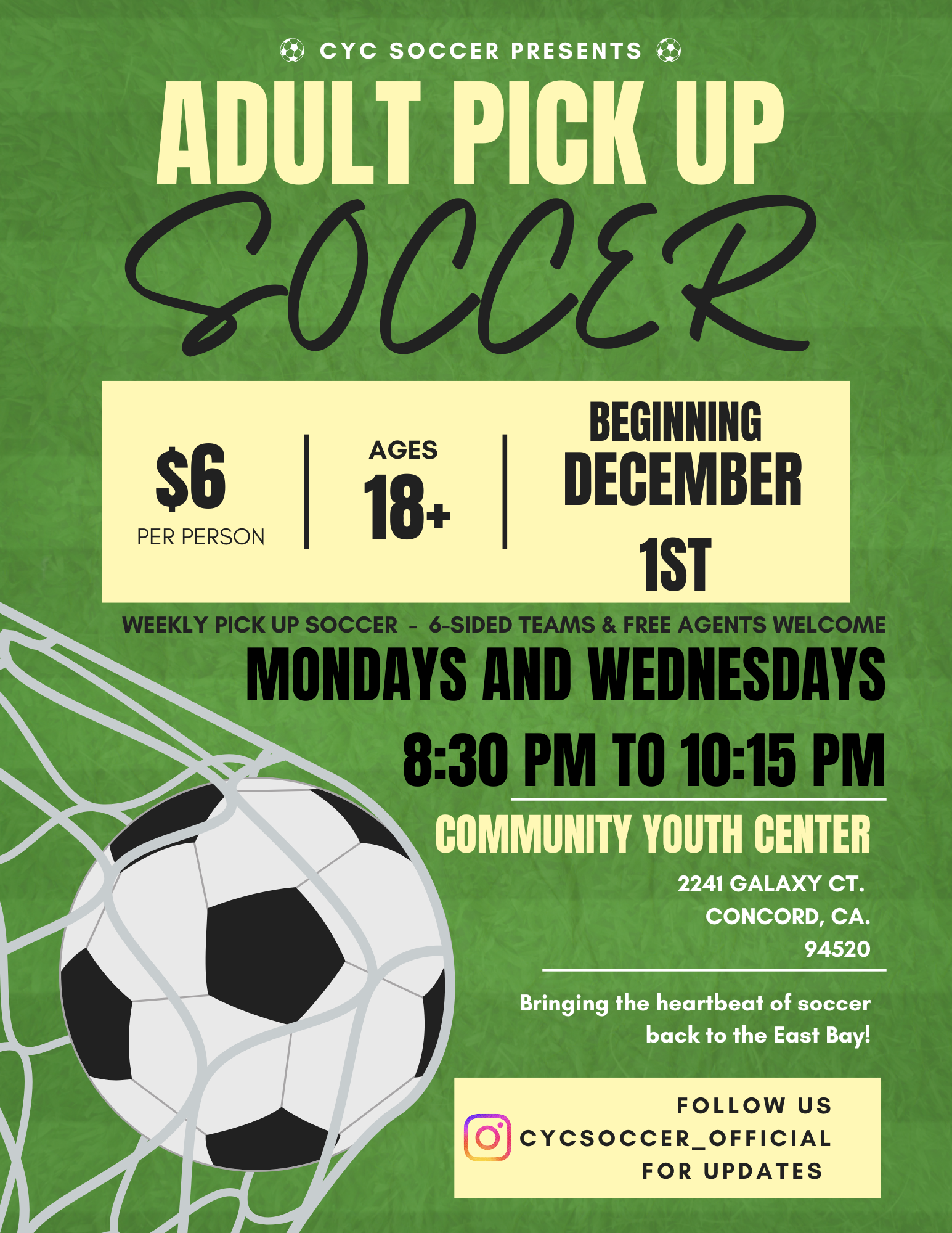CYC Soccer is excited to bring weekly adult pick-up games back to the East Bay! Whether you're looking to stay active, meet new people, or jump into a fun and competitive environment, our sessions are open to all players ages 18 and up. Free agents are always welcome, and teams are formed on-site with 6-sided squads.